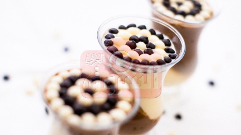 نفرغ كريمة الشكولاطة البيضاء في قوالب التقديم،  نتركها تبرد قليلا ثم نضيف كريمة الشكولاطة السوداء و ندخلها للثلاجة لتبرد، عند تقديمها نزينها بالكريات الشكولاطة السوداء و البيضاء.
