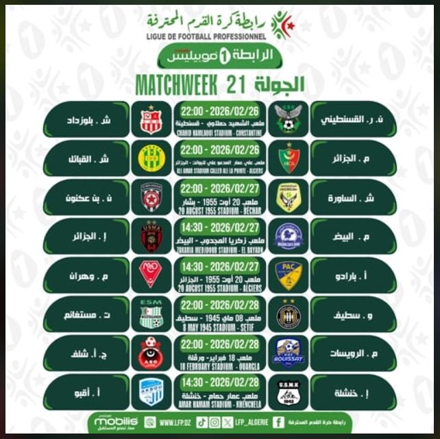 ويُقام هذا اللقاء بِملعب “علي لبوانت” بِالدويرة، في الـ 26 من فيفري الحالي على الساعة العاشرة ليلا.