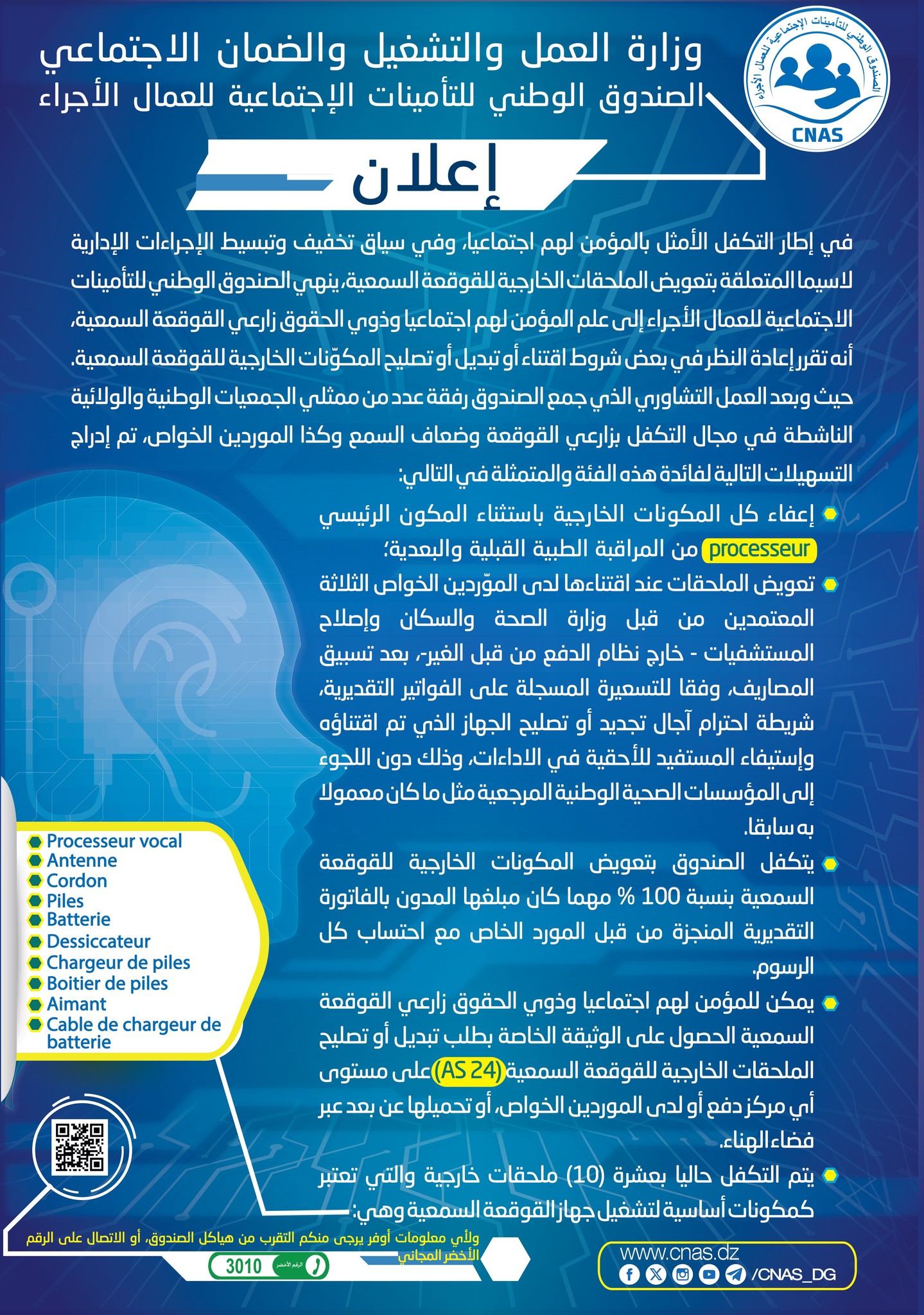 أعلن الصندوق الوطني للتأمينات الاجتماعية للعمال الأجراء (CNAS)، الأحد، عن إدخال تعديلات جديدة تهدف إلى تسهيل عملية اقتناء، تجديد، وتصليح الملاحق الخارجية للمعينات السمعية لفائدة المؤمن لهم اجتماعياً، وذوي الحقوق بمن في ذلك الأرامل واليتامى القُصر.
