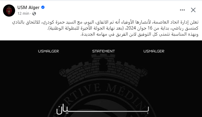وقالت إدارة الاتحاد في بيان لها: “تعلن إدارة اتحاد العاصمة، لأنصارها الأوفياء أنه تم الاتفاق، اليوم، مع السيد حمزة كودري، للالتحاق بالنادي كمنسق رياضي، بداية من 16 جوان 2024، بعد نهاية الجولة الأخيرة للبطولة الوطنية”.