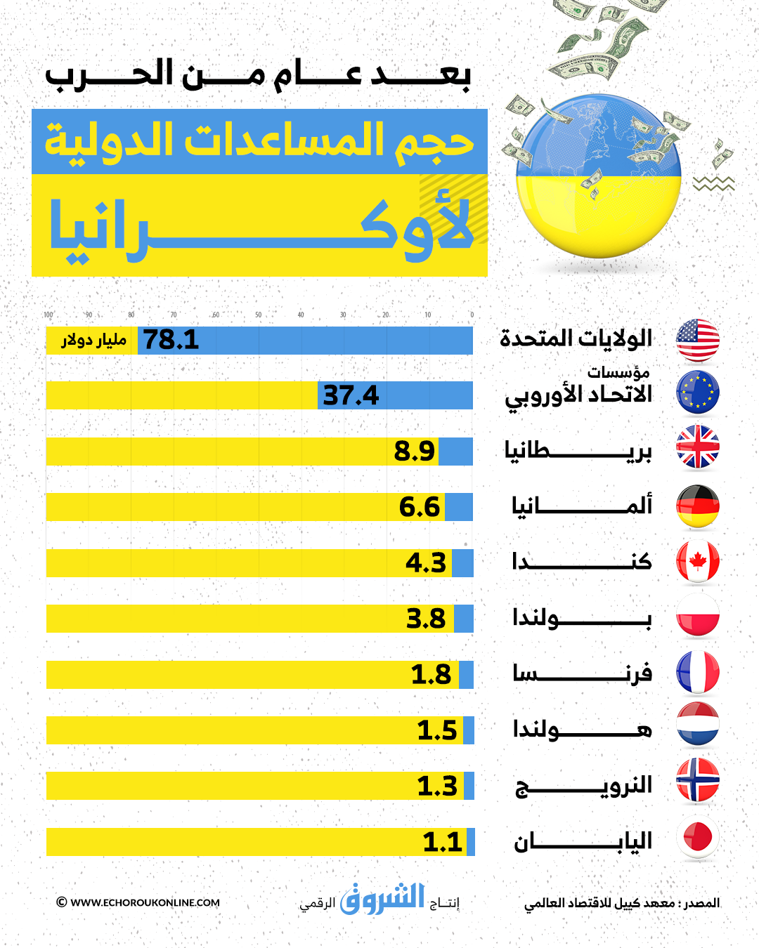 هذا هو حجم المساعدات الدولية لأوكرانيا بعد عام من الحرب