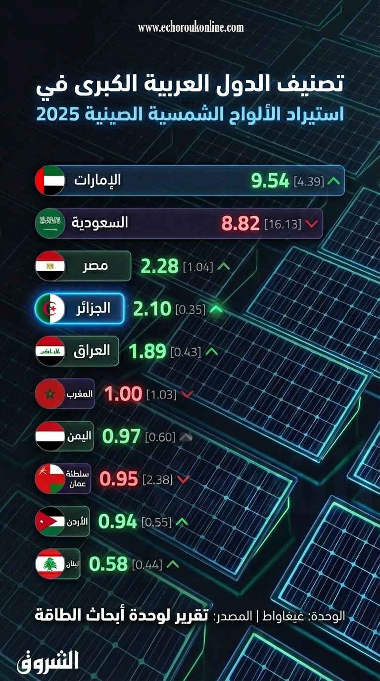 ووفق البيانات، جاءت الجزائر في المركز الرابع ضمن القائمة بعد الإمارات والسعودية ومصر، فيما برز العراق إلى جانبها كقوة صاعدة بدخوله لأول مرة ضمن كبار المستوردين، مع ارتفاع وارداته من 0.43 غيغاواط في 2024 إلى 1.89 غيغاواط في 2025.