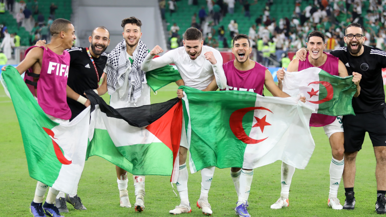 رفع لاعبو المنتخب المحلّي الجزائري علم فلسطين عاليا سهرة السبت، وهو يحتفلون بِتأهّلهم للدور نصف النهائي من عمر منافسة كأس العرب.