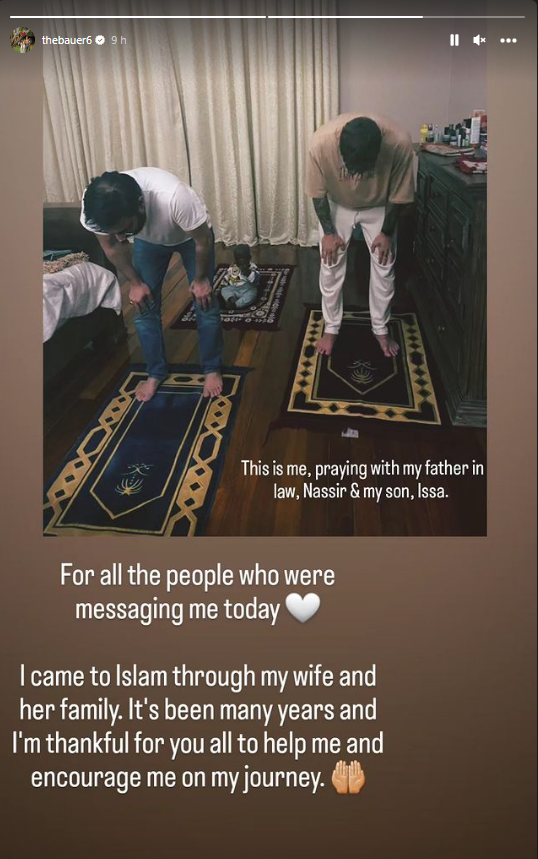 ونشر اللاعب الألماني صورته وهو يصلي عبر “ستوري” حسابه على إنستغرام: “لكل من راسلني اليوم، ها أنا أصلي مع والد زوجتي ناصر وابني عيسى، لقد دخلت الإسلام عن طريق زوجتي وعائلتها، لقد مرت سنوات عديدة وأنا ممتن لكم جميعا لمساعدتي وتشجيعي في رحلتي”.