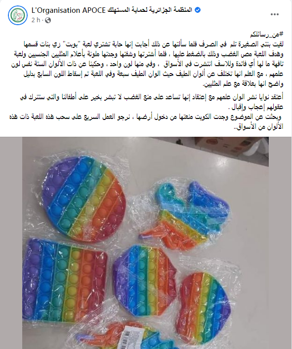 أثارت لعبة بوب إت “ pop it” التي يروج لها على أنها تساعد على التركيز والإدراك، جدلا واسعا في الجزائر والعالم العربي نظرا لتشابه ألوانها مع علم المثليين.