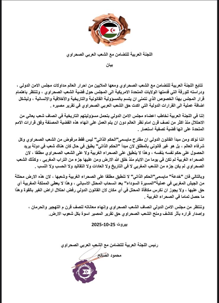 وقالت اللجنة، في بيان صادر من بيروت، بتاريخ 25 أكتوبر إنها، ومعها ملايين الأحرار حول العالم، تتابع باهتمام مداولات مجلس الأمن بشأن المقترح الأمريكي المتعلق بالقضية الصحراوية.