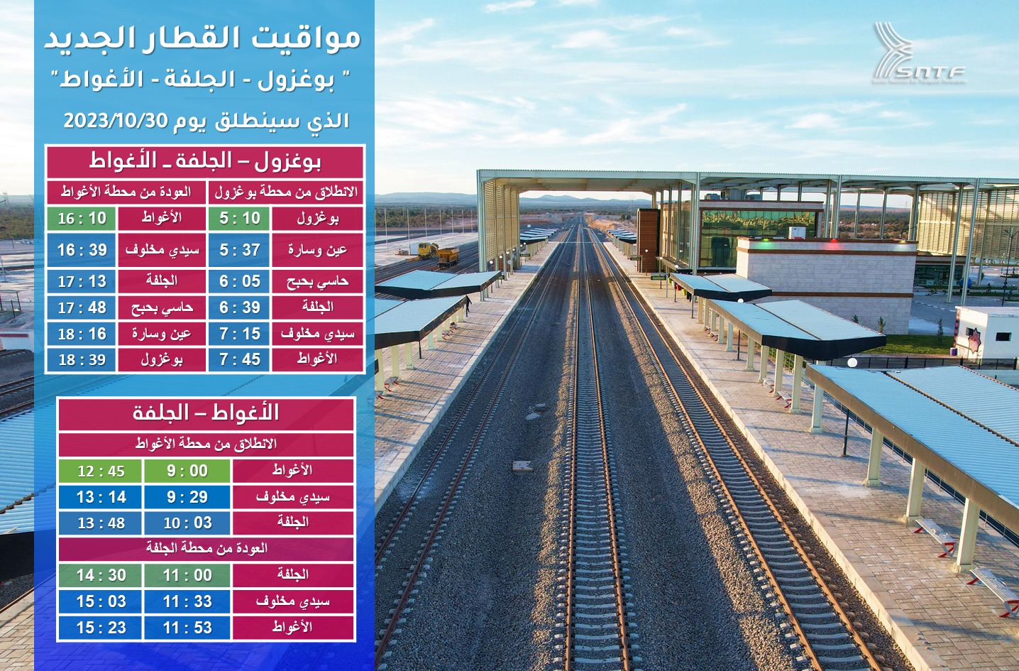 كما يضمن الخط الجديد إمكانية التنقل بين ولايتي الجلفة والأغواط عبر رحلتين إضافيتين حسب البرنامج التالي: