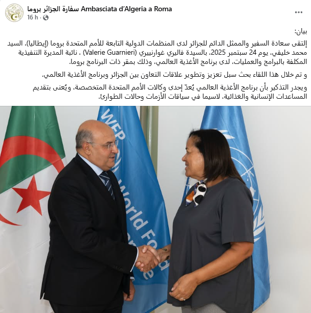 التقى السفير والممثل الدائم للجزائر لدى المنظمات الدولية التابعة للأمم المتحدة بروما، محمد خليفي، يوم أمس الأربعاء، بنائبة المديرة التنفيذية المكلفة بالبرامج والعمليات في برنامج الأغذية العالمي، فاليري غوارنييري، وذلك بمقر البرنامج بالعاصمة الإيطالية.