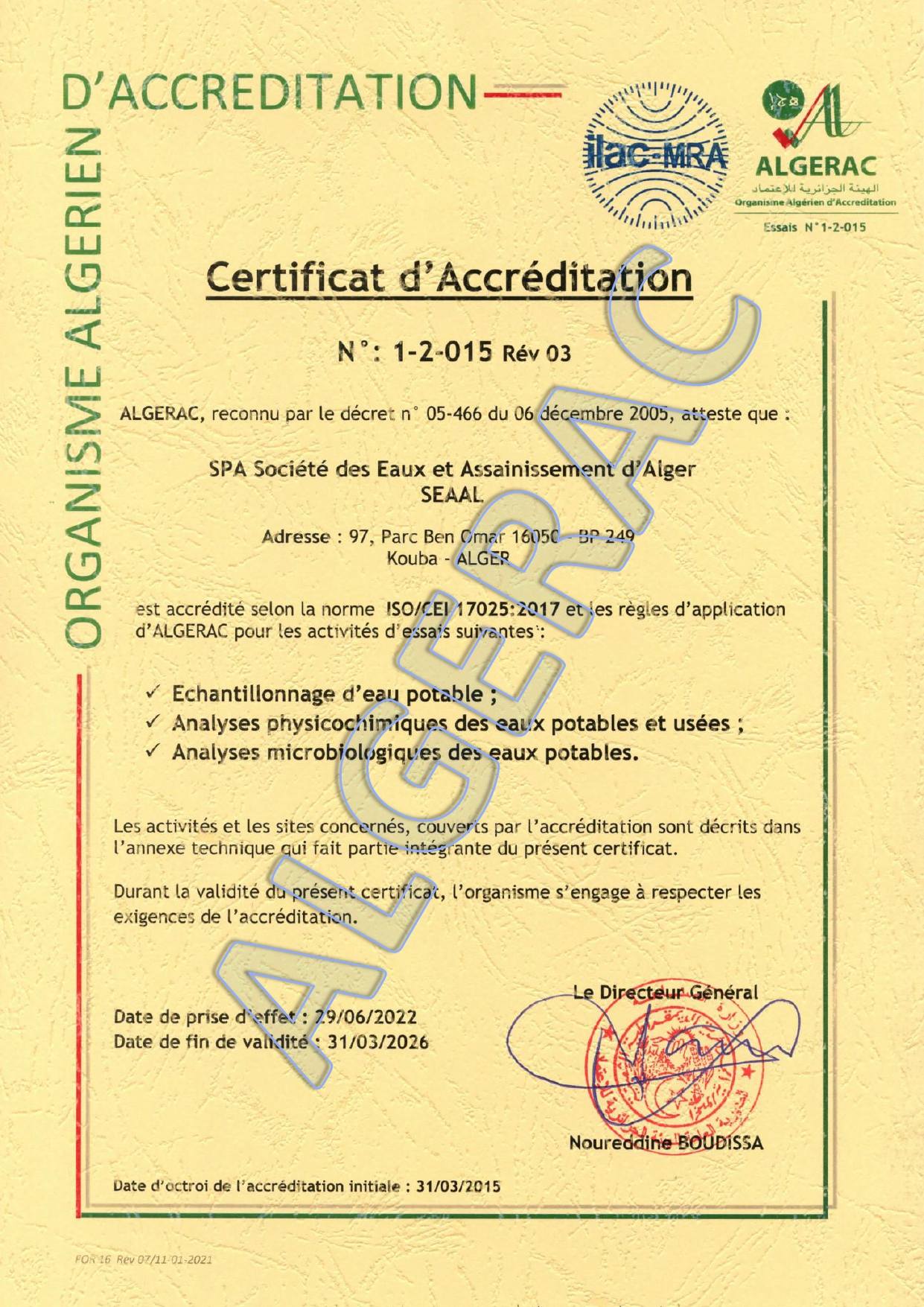 وفي سياق موازٍ، تمكنت سيال من تجديد اعتماد مخبرها المركزي وفق معيار أيزو 17025، بعد تدقيق الهيئة الجزائرية للاعتماد يومي 23 و24 أفريل 2025. ويشمل هذا الاعتماد 43 تركيبة فيزيوكيميائية وميكروبيولوجية، تغطي تحاليل مياه الشرب والمياه المستعملة، إضافة إلى عمليات أخذ العينات والقياسات الميدانية.