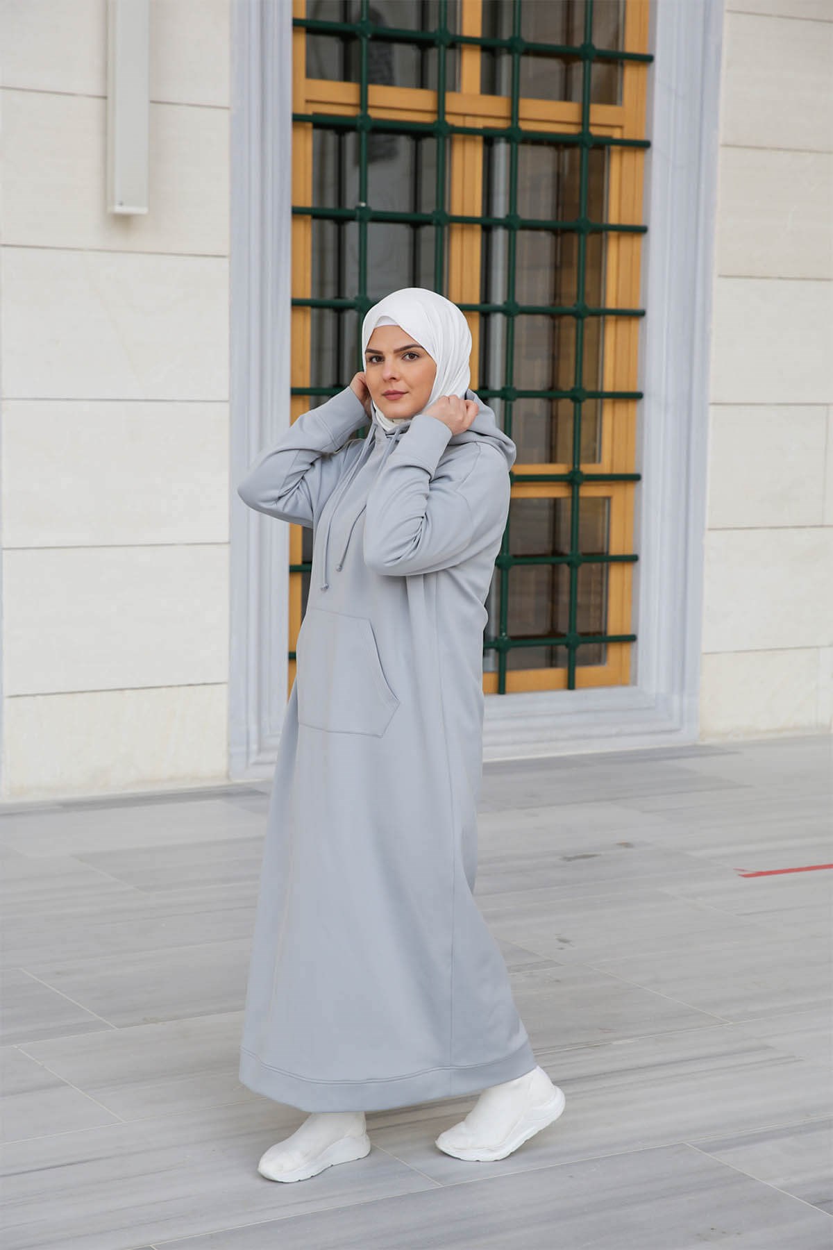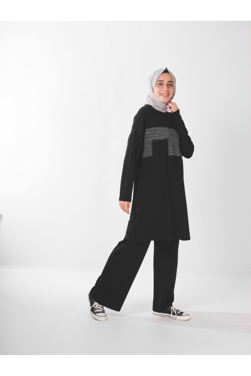 طلة رياضية بتونيك طويلة وسروال رياضي “سورفت” عريضة باللون الأسود منسقة بخمار رمادي وسنيكرز.