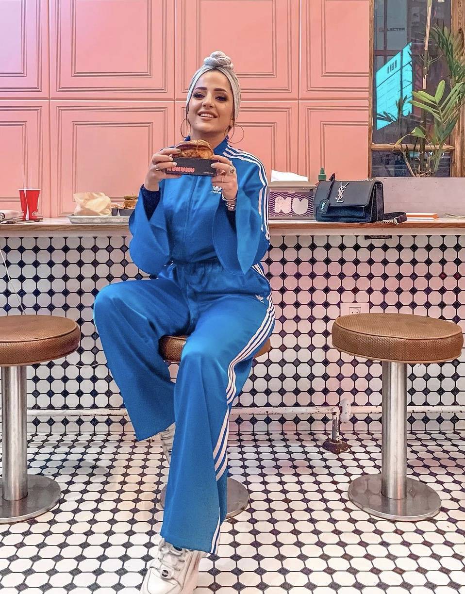 أديداس تلبس المحجبات أيضا مع بدلة رياضية كاملة باللون الأزرق، الأكمام عريضة ومفتوحة والتوربان يكمل هذه الطلة. التنسيق يكون بحقيبة يد صغيرة وبعض الاكسسوارات مثل أقراط الكريول الدائرية.
