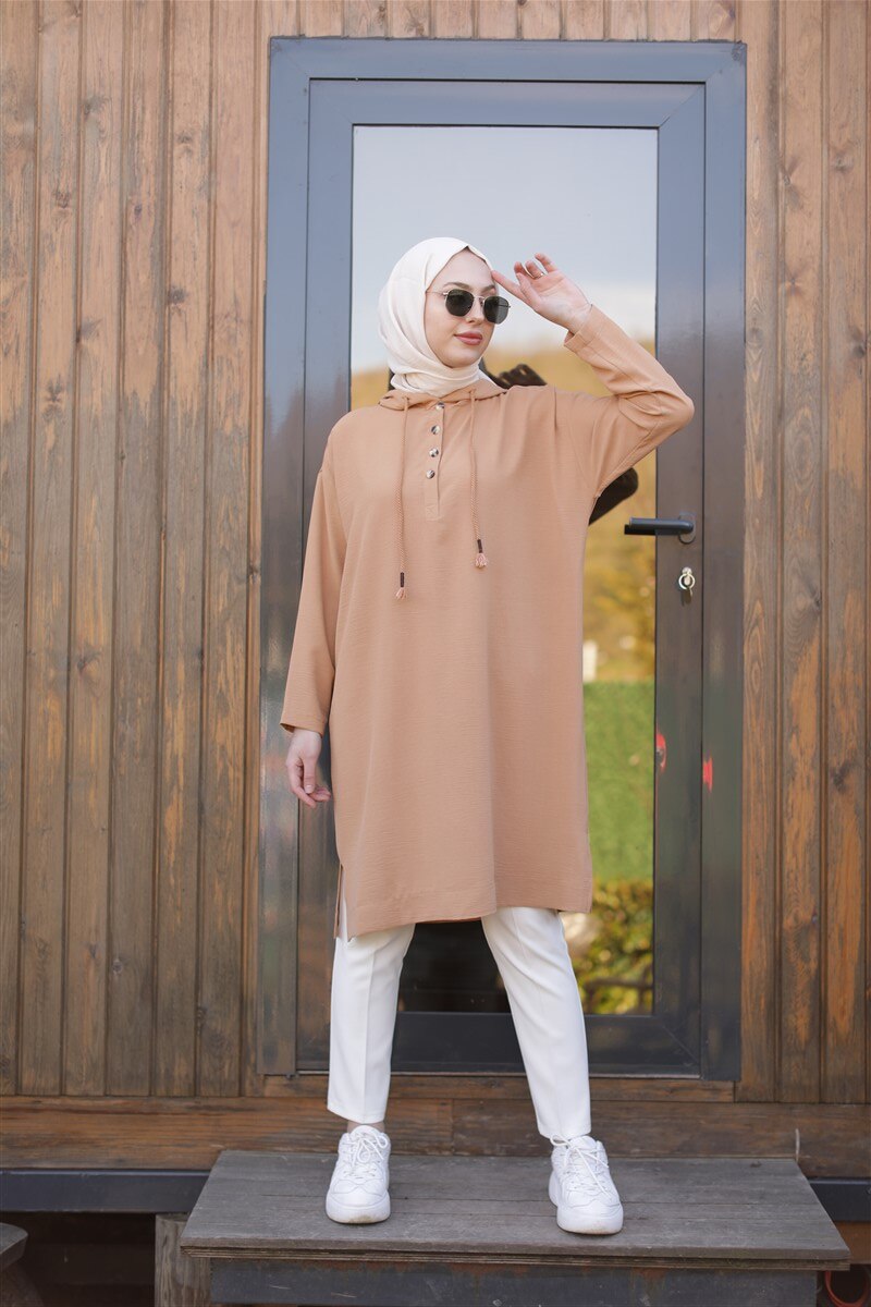طلة رياضية جميلة تجمع بين تونيك للركبة باللون الجملي وسروال أبيض، التنسيق سيكتمل بحذاء رياضي أبيض وخمار بيج يكسر رتابة التونيك.