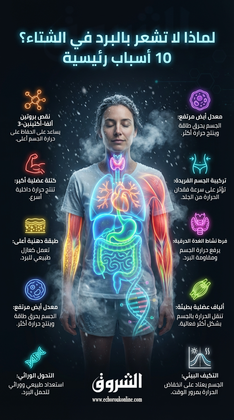 معدل أيض مرتفع: بعض الناس لديهم تمثيل غذائي (أيض) أسرع، فأجسامهم “تحرق طاقة” وتنتج حرارة أكثر حتى في الراحة، ما يصعب عليهم الشعور بالبرد.