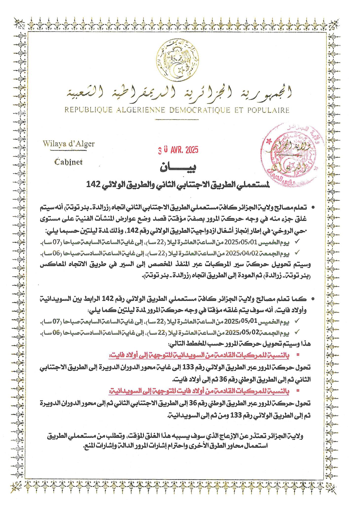 أعلنت مصالح ولاية الجزائر عن غلق مؤقت لجزء من الطريق الاجتنابي الثاني، في الاتجاه الرابط بين بئر توتة وزرالدة، وكذا شطر من الطريق الولائي رقم 142 الرابط بين السويدانية وأولاد فايت، وذلك في إطار أشغال إنجاز ازدواجية الطريق الولائي 142،