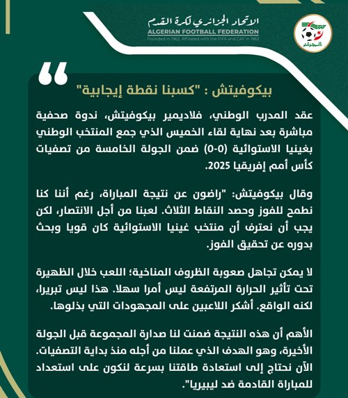 جاء ذلك على لسان النّاخب الوطني فلاديمير بيتكوفيتش، في مؤتمر صحفي نشّطه بعد نهاية المباراة، وكما نقل تفاصيله اتحاد الكرة الجزائري.