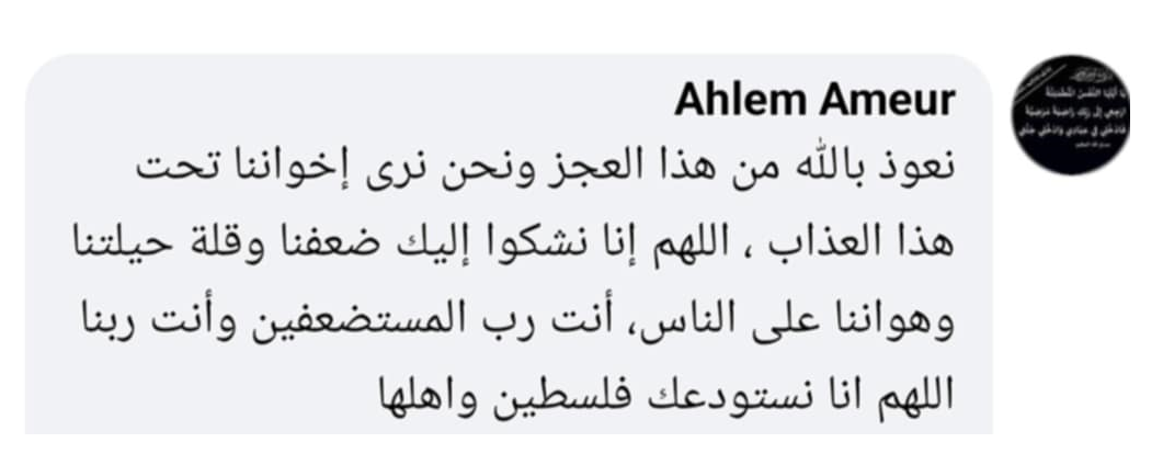 وقالت أحلام عامر: “نعوذ بالله من هذا العجز ونحن نرى إخواننا تحت هذا العذاب، اللهم إنا نشكو إليك ضعفنا وقلة حيلتنا وهواننا على الناس، أنت رب المستضعفين وأنت ربنا اللهم إنا نستودعك فلسطين وأهلها”
