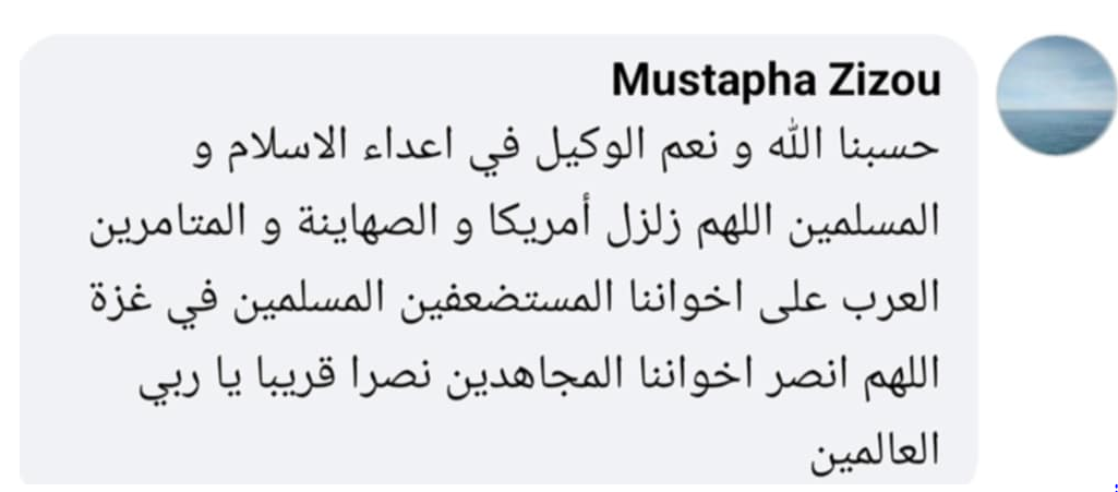 “حسبنا الله ونعم الوكيل في أعداء الاسلام والمسلمين، اللهم زلزل أمريكا والصهاينة والمتآمرين العرب على اخواننا المستضعفين المسلمين في غزة، اللهم انصر اخواننا المجاهدين نصرا قريبا يا ربي العالمين”.