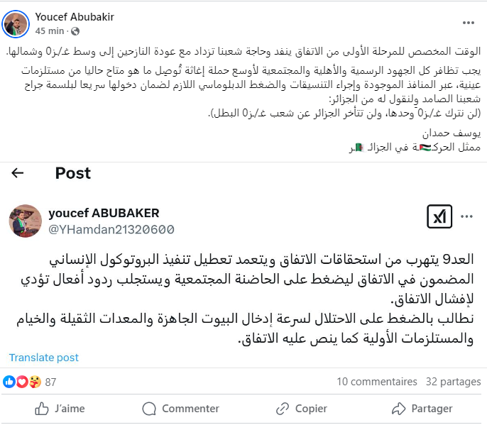 وقال حمدان في منشوره الموجه إلى الجزائريين “إن الوقت المخصص للمرحلة الأولى من الاتفاق ينفد وحاجة أهل غزة تزداد مع عودة النازحين إلى وسط غزة وشمالها.”