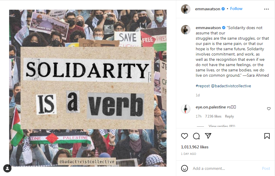 وأعادت الممثلة البريطانية التي اشتهرت بتجسيد دور هيرميون غرينجر، في سلسلة أفلام “هاري بوتر”، نشر تدوينة تضامنية مع الشعب الفلسطيني، لناشطة تدعى سارة أحمد، على حسابها في تطبيق إنستغرام.
