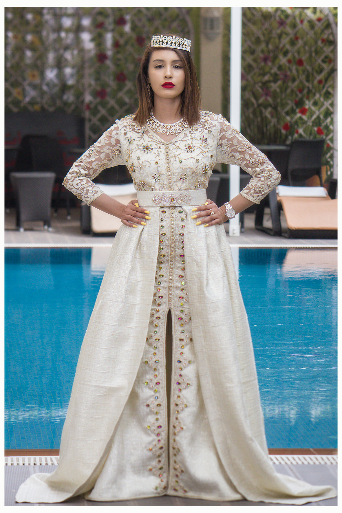 قفطان أبيض مطرز مرصع ومطرز بالخيوط الذهبية.