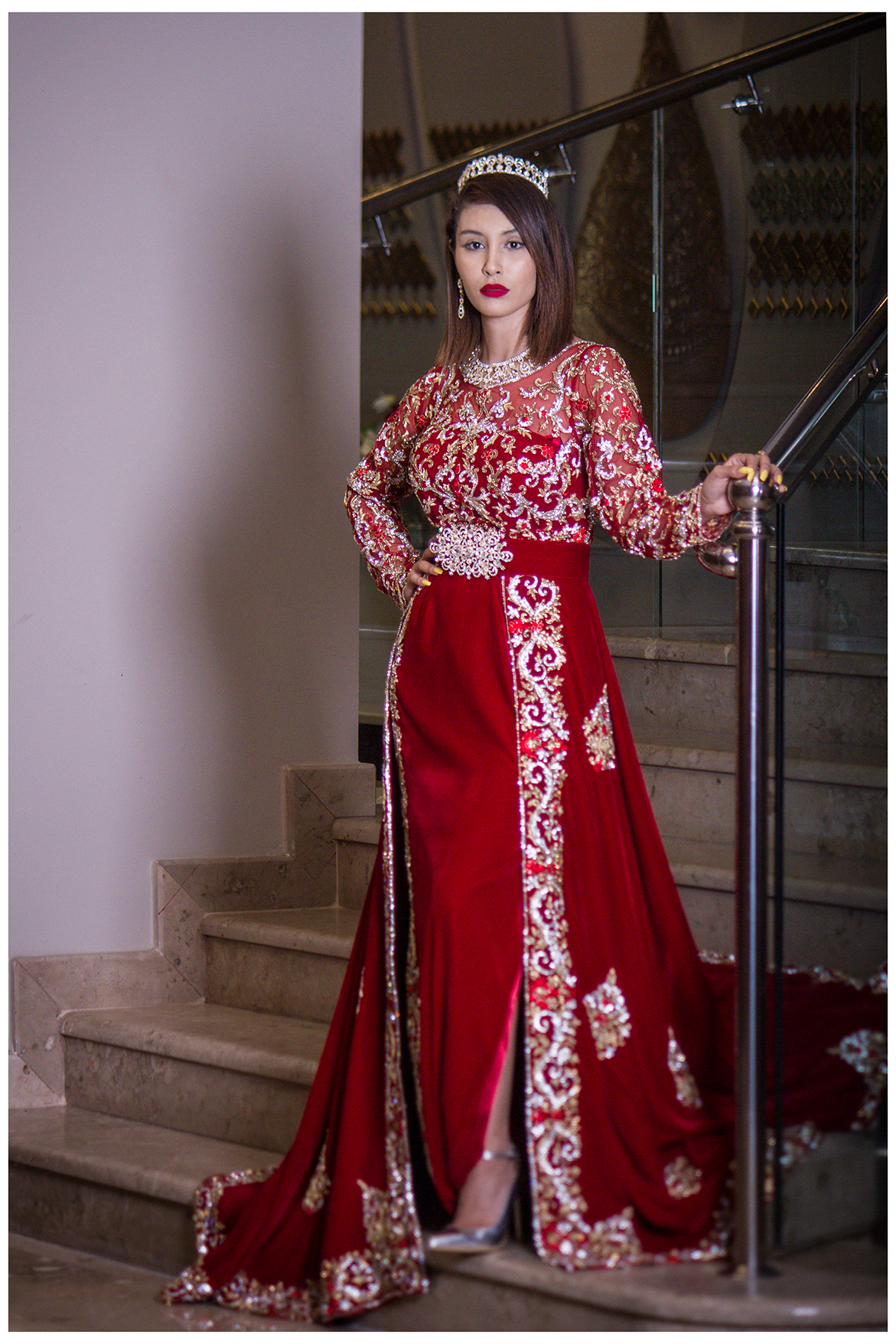 موديل مميز بالأحمر المترف يمزج بين القفطان وسروال الشلقة العاصمي منسق بحزام أنيق.