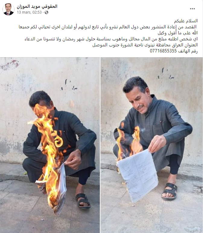 وقال الرجل وهو حقوقي يدعى مويد الموزان، ويملك محلا للمواد الغذائية إنه لا يريد شيئًا سوى أن تمر أيام الناس بسلام، موضحا بأن السبب الذي دفعه لإعادة نشر الصور كان بسبب الأشخاص الذين نسبوه لدولهم في منشوراتهم.