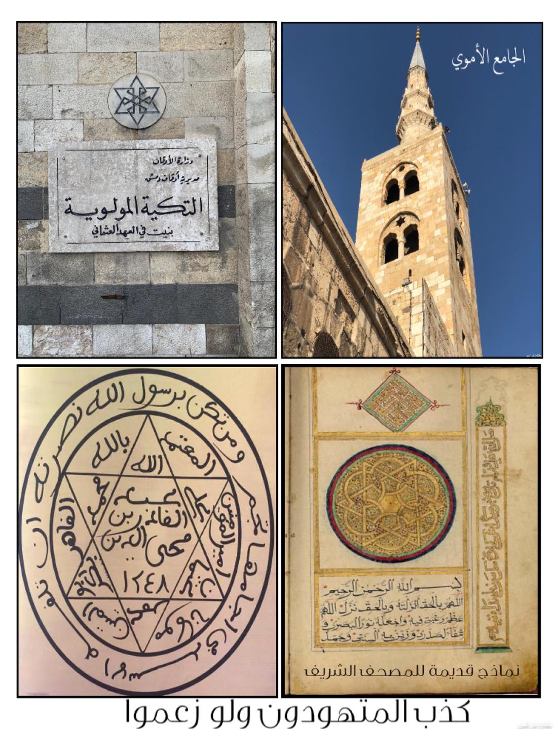 وتابعت أن “هذا النَّهجُ أدخلَ الرّيبة حول ذاتنا، وانتمائنا القديم لآثارنا وتُراثنا، ولا نستبعدُ بعدَ هذا المسخِ الثقافي مستقبلاً خروجَ بعضِ الأصواتِ التي تدّعي أنﱠ المسجدَ الأمويﱠ من التراثِ اليهوديﱢ بسبب النجمة السداسية المنقوشةِ على مئذنةِ العروس”.
