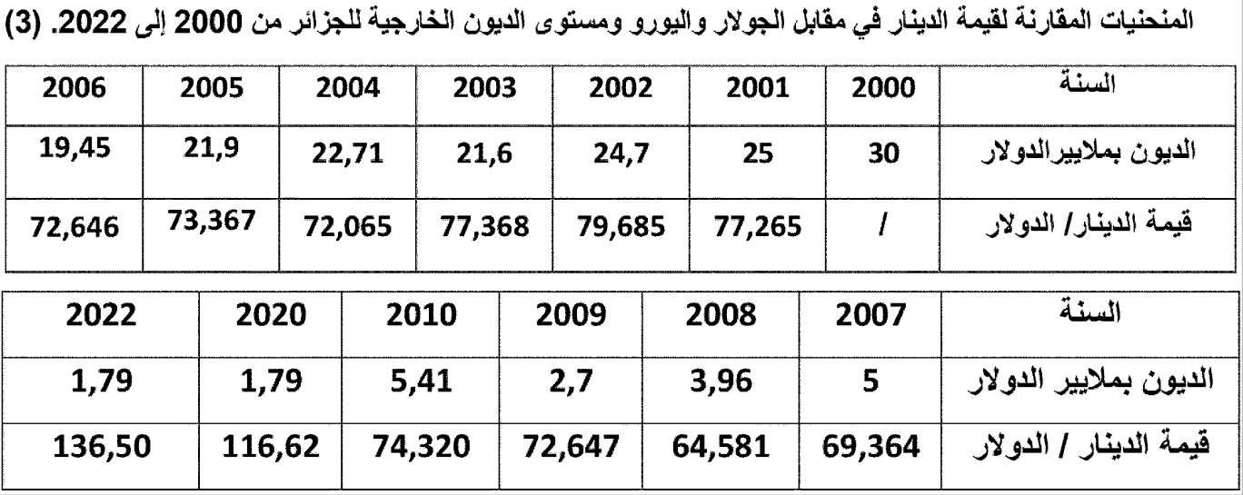 فالمؤسسات المالية الدولية توصي ”آمرة” باستمرار، وبإلحاح شديد، بتعويم الدينار. ويتعلق الأمر في واقع الحال، بتخفيض مستمر لقيمة العملة الوطنية. إنها نفس التوصيات ”الآمرة” التي أعطتها، من قبل، هذه المؤسسات المالية الدولية للجزائر في إطار إعادة جدولة ديونها الخارجية خلال السنوات الأولى من عشرية 1990. وذلك ما تم تنفيده، بالفعل، إلى حد كبير. هي خدعة انطلت على المسؤولين الجزائريين الذين أقروها وصادقوا عليها وطبقوها والذين كانوا مباشرة مسؤولين على الملف. وكذا المسؤولون السياسيون لنفس الفترة. وتستحق هذه الوقائع الاستذكار لحاجات الجزائر للاستفادة منها في الوقت الراهن ولحاجاتها المستقبلية إذا استدعت ذلك الظروف المختلفة. فتسارع هذا التعويم غير المعلن، في اتجاه انخفاض قيمة الدينارحصرا، قد طبع، بصفة عميقة، صدور قانون المالية لسنة 2021. فانخفاض الدينار قد تطورفي الاتجاه المعاكس لانخفاض مستوى المديونية الخارجية للبلاد، تفنيدا، بالتالي، للأطروحة التي ترافع لتوازي تحرك المنحنيين (منحنى المديونية الخارجية ومنحنى تطور قيمة الدينار). ولا تمثل حالة سنة 2010 سوى استثناء مهمل الأثر. وهو ما يعكسه الجدول الموالي بوضوح كاف: