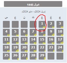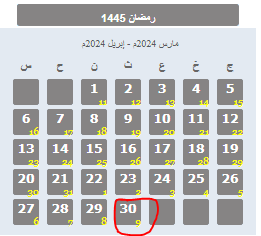حيث يظهر في التقويم السنوي لعام 1445 هجري، أن يوم الثلاثاء 9 أفريل 2024، سيكون متمّما لرمضان 30 يوما. ليكون الأربعاء 10 أفريل، أول أيام عيد الفطر.