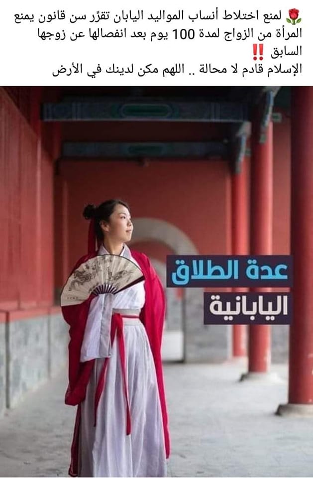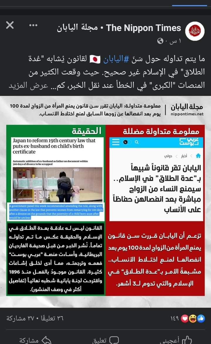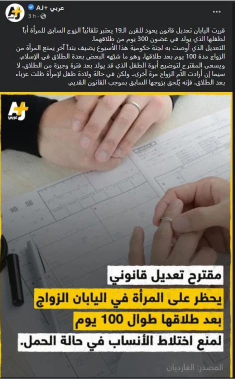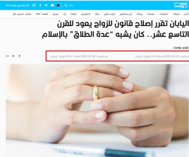 ضجّت مواقع التواصل الاجتماعي بخبر إقرار اليابان قانونا يمنع المرأة من الزواج لمدة 100 يوم بعد انفصالها عن شريكها، وقالوا بأنه يشبه عدّة الطلاق في الإسلام.