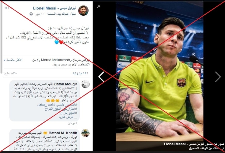 يتناقل مستخدمون لمواقع التواصل الاجتماعي صورةً للاعب كرة القدم الأرجنتيني ليونيل ميسي مرفقة بالادعاء أنه رفض المشاركة في مباراة تجمع منتخب بلاده والمنتخب الإسرائيلي لأنه “لا يلعب أمام أناس يقتلون الأطفال الأبرياء”.