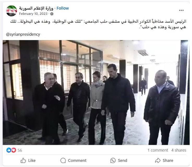 كان الأسد يزور مصابي الزلزال الذي ضرب مناطق واسعة في شمال وغرب سوريا بقوة 7.8 درجة على مقياس ريختر.