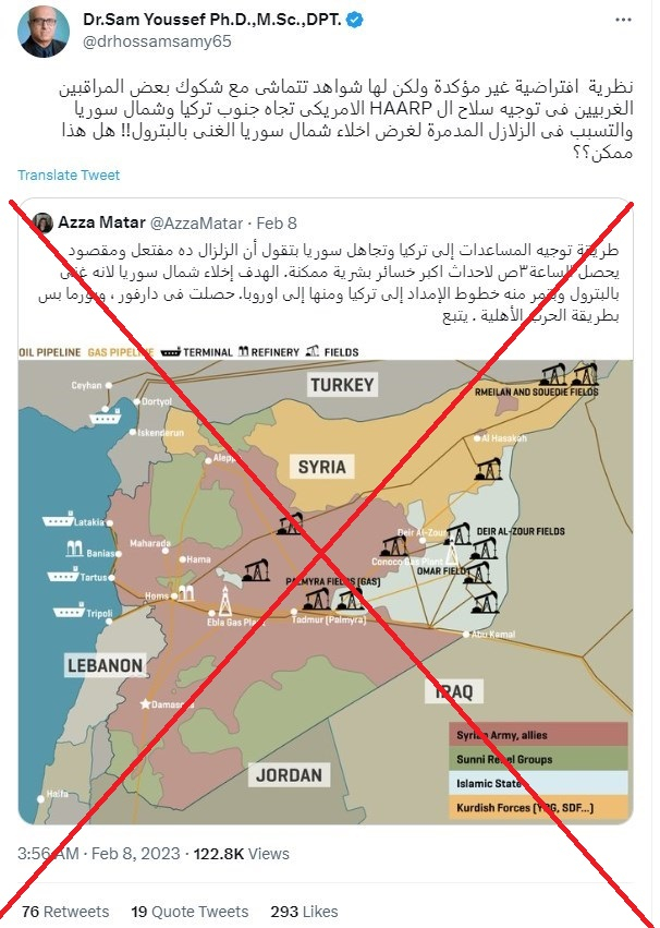 فعقب الكارثة التي حلّت بمناطق واسعة من تركيا وشمال سوريا فجر الاثنين في السادس من شباط/فبراير الحالي، وأسفرت عن مقتل عشرات الآلاف وتدمير هائل، توالت المنشورات المضلّلة على مواقع التواصل الاجتماعي، منها نظريّات مؤامرة عن أسباب مُفتعلة لهذا الزلزال الذي بلغت قوّته 7,8 درجات.