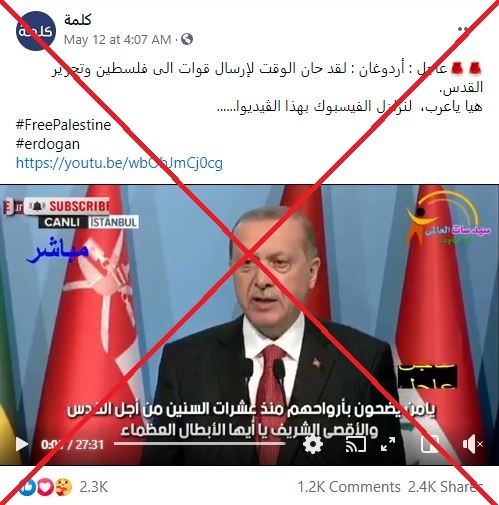 وأرفق الفيديو بترجمة إلى العربيّة لكلام أردوغان، وزعموا أنه قال: “لقد حان الوقت لتدفع إسرائيل ثمن جرائمها…لقد نفذ صبرنا من المجموعات الإرهابية التي تدمّر مقدّساتنا.