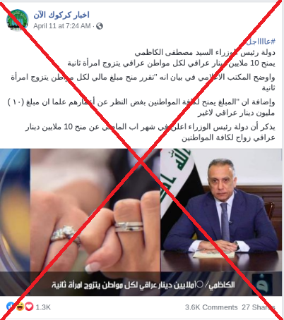 وتداول مستخدمون، لاسيما في العراق منشورا جاء فيه: “رئيس الوزراء السيّد مصطفى الكاظمي يمنح عشرة ملايين دينار عراقي لكلّ مواطن عراقي يتزوّج بامرأة ثانية”.