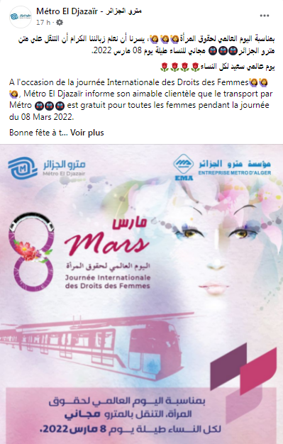 وقالت المؤسسة عبر حسابها الرسمي على فيسبوك: “بمناسبة اليوم العالمي لحقوق المرأة، يسرنا أن نعلم زبائننا الكرام أن التنقل على متن مترو الجزائر مجاني للنساء طيلة يوم 08 مارس 2022”.
