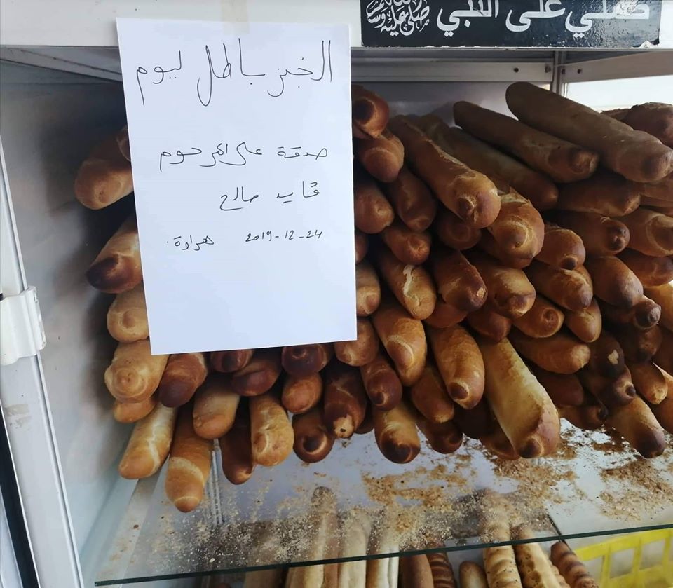 في مختلف ولايات الوطن شرقا وغربا شمالا وجنوبا علّق بعض التجار لافتات على بعض سلعهم وخدماتهم التي عرضوها مجانا أمام الزبائن صدقة على روح القايد صالح الذي وافته المنية صباح الاثنين، إثر سكتة قلبية، حيث كتب أحد التجار بمنطقة عين أمناس “الخبز باطل صدقة على القايد صالح رحمه الله والأمر نفسه في بلدية حاسي بحبح بولاية الجلفة” وكتب آخر بولاية المدية بمنطقة عين الذهب “الياغورت والخبز اليوم باطل على روح القايد”، أمّا تاجر آخر فقدم البرتقال والموز مجانا حسب ما ظهر من لافتة كبيرة عرضت إلى جانب سلعته”.