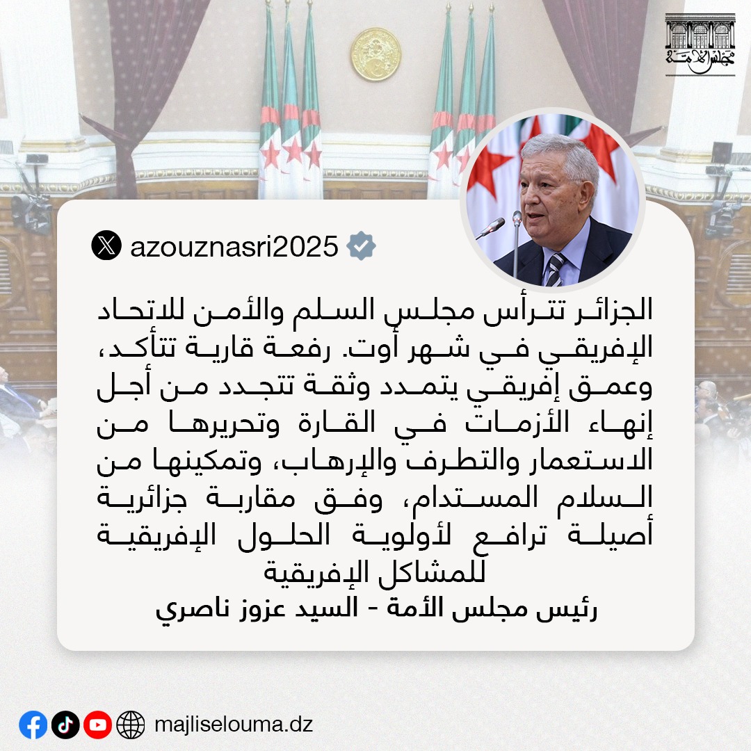 وفي تغريدة نشرها عبر حسابه الرسمي على منصة X، أكد ناصري أن رئاسة الجزائر لهذا الجهاز الهام تعكس “رفعة قارية تتأكد، وعمق إفريقي يتمدد، وثقة تتجدد”، مشددًا على أن الجزائر ستعمل على إنهاء الأزمات في القارة، وتحريرها من “الاستعمار والتطرف والإرهاب”، وصولًا إلى تحقيق السلام المستدام.
