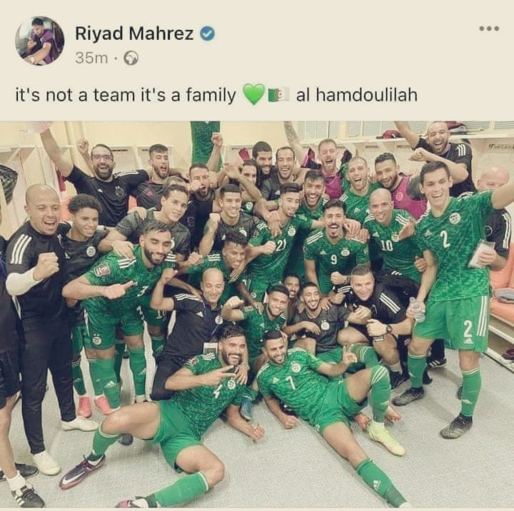 ونشر قائد “الخضر” رياض محرز عل حسابه الخاص على “فايسبوك” صورة جماعية للمنتخب بعد المباراة، وقال: ” ليس فريقا فقط، هذه عائلة واحدة، الحمد لله”.