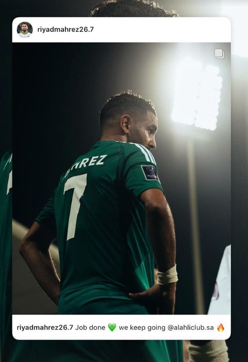 وكتب محرز عبر حسابه على “إنستغرام”، معلقا على الفوز المحقق: ” أنجز العمل وسنستمر في ذلك”.