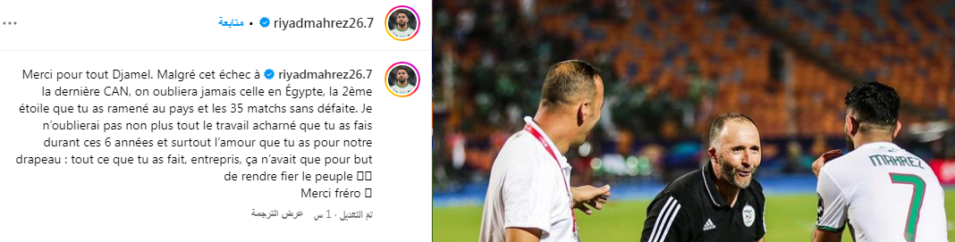 ونشر رياض محرز رسالة عبر حسابه على “انستغرام”، قال فيها: “شكرا على كل شيء جمال، على الرغم من هذا الفشل في كأس الأمم الأفريقية الأخيرة، لن ننسى أبدًا، الانجاز المحقق في مصر، والعودة إلى البلاد بالنجمة الثانية، والمباريات الـ35 دون هزيمة”.