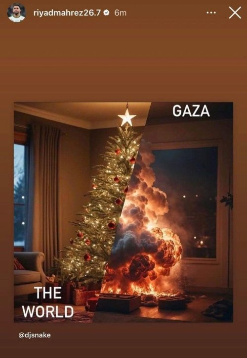 وفي ظهور له عبر منصّة التواصل الاجتماعي “إنستغرام” مساء الأحد، نشر محرز صورة يُبرز نصفها شجرة أعياد الميلاد، ودّون أمامها كلمة “العالم”. ويُشير النّصف الآخر إلى التخريب الصّهيوني لِمساكن الفلسطينيين، وتقتيل الأبرياء والعزّل، مُدوّنا أمامها كلمة “غزّة”.
