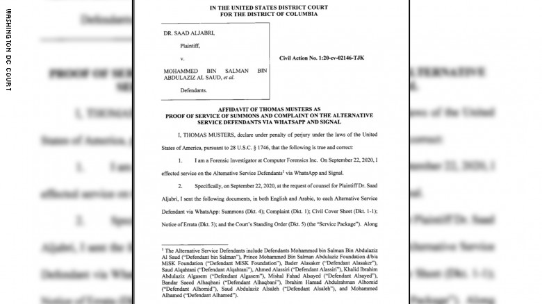 وأظهرت وثيقة لمحكمة واشنطن، بتاريخ الخميس 29 أكتوبر الجاري، أنها أرسلت مذكرة ورسائل استدعاء الأمير عبر “واتساب” باللغتين العربية والإنجليزية، في 22 سبتمبر.