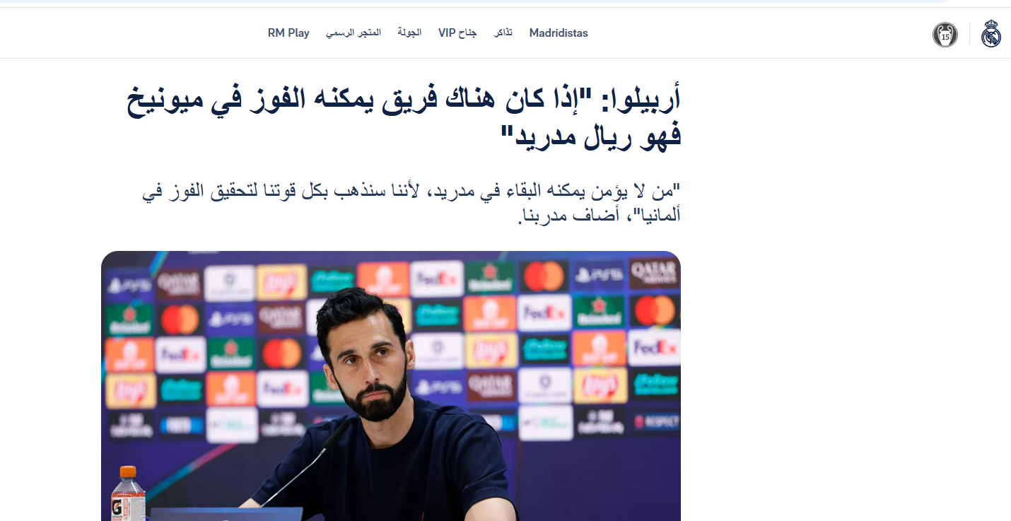 أكد مدرب ريال مدريد، ألفارو أربيلوا، أن فريقه قادر على الفوز أمام بايرن ميونيخ في لقاء إياب ربع نهائي دوري أبطال أوروبا.