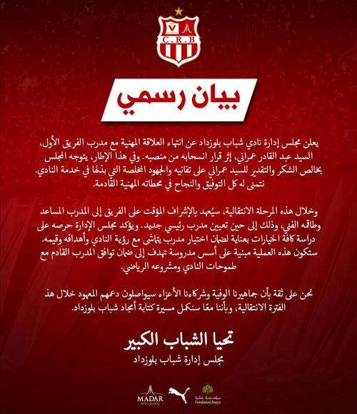 أعلنت إدارة نادي شباب بلوزداد سهرة السبت، عن رحيل التقني عبد القادر عمراني مدرب فريقها الكروي.