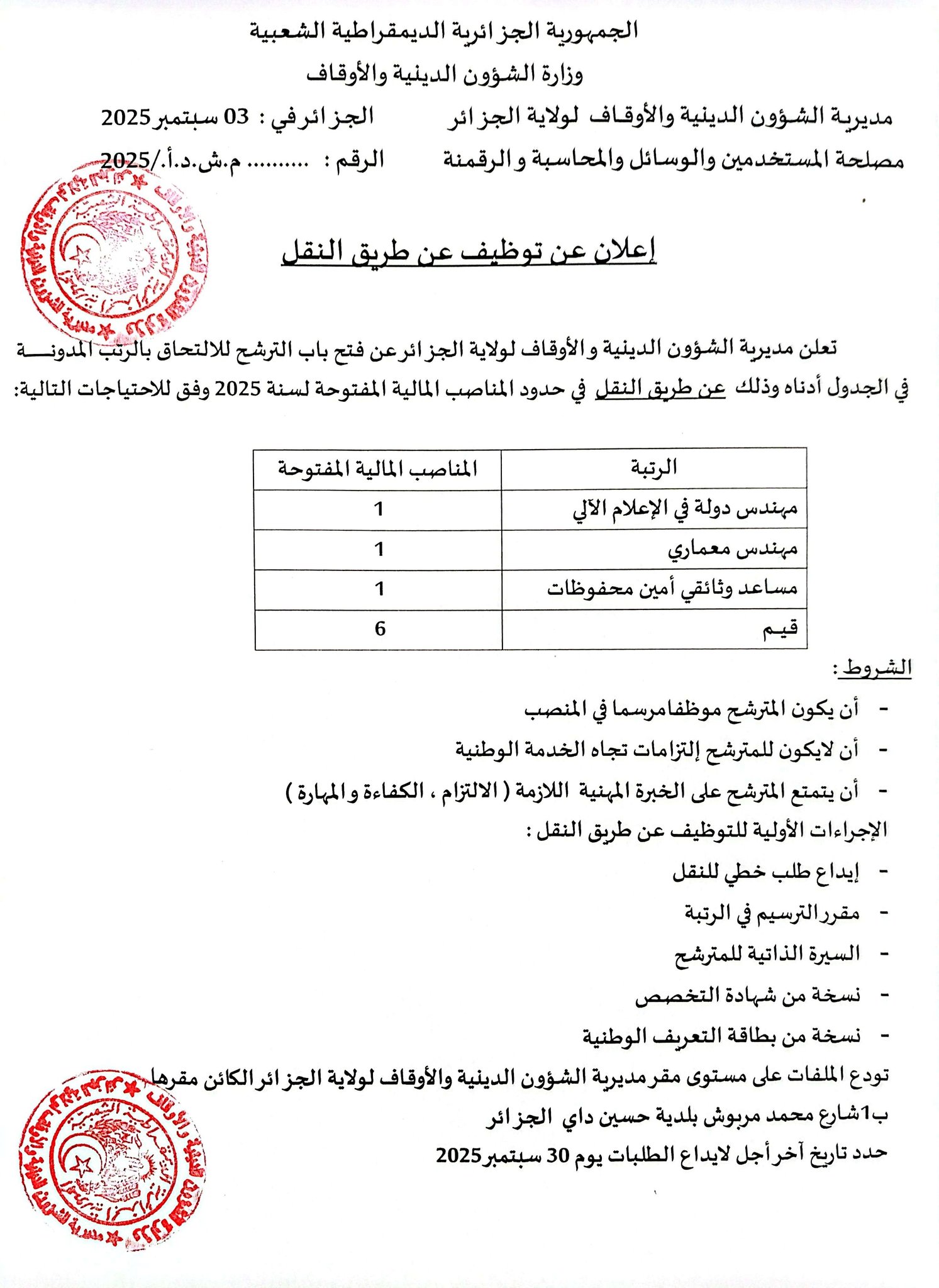 أعلنت مديرية الشؤون الدينية والأوقاف لولاية الجزائر، الأربعاء، عن فتح باب الترشح لشغل عدد من المناصب لسنة 2025، وذلك عن طريق النقل، في حدود المناصب المالية المفتوحة.