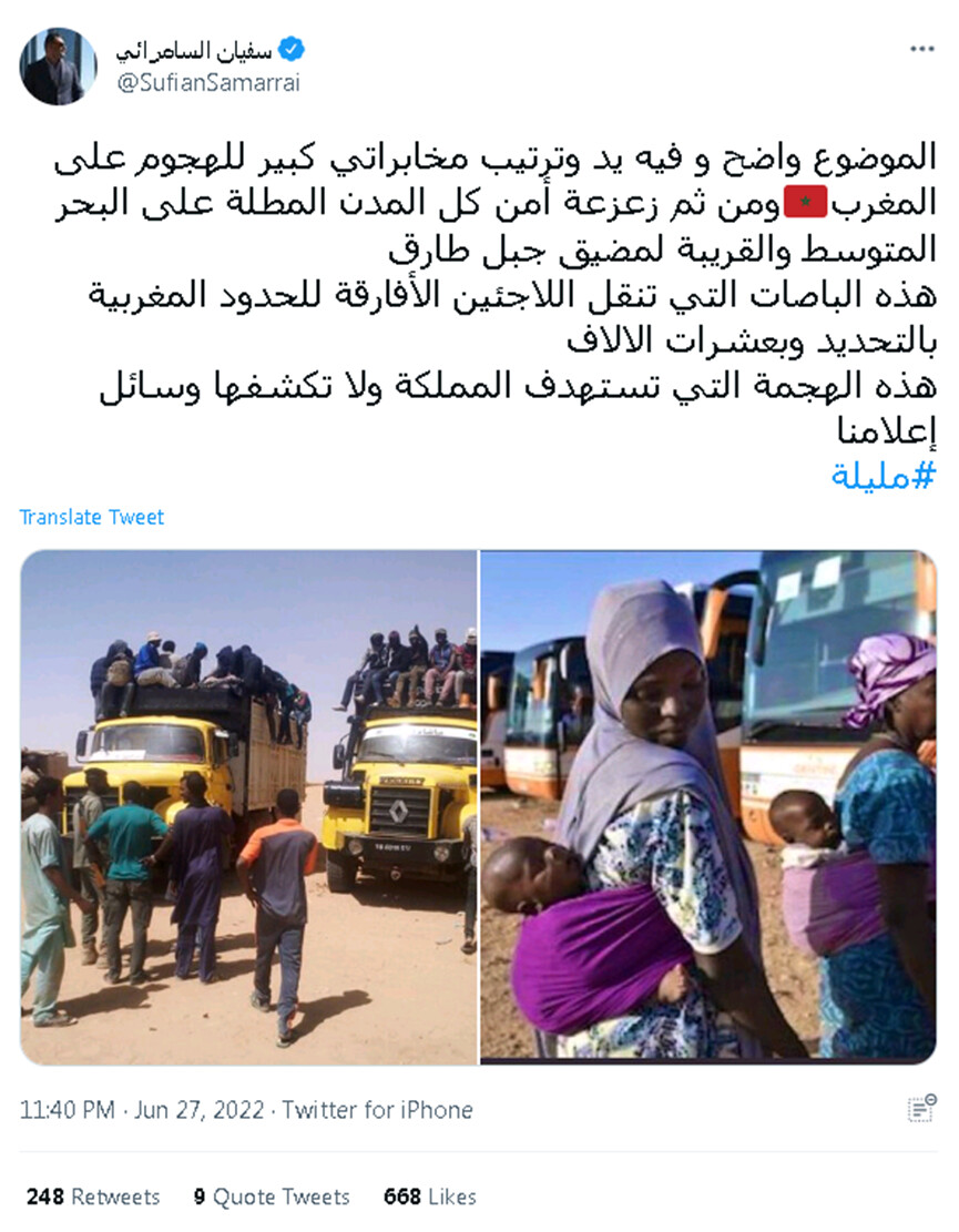 وفي 10 جويلية 2022، كشف موقع إخباري أكاذيب إعلام النظام المغربي حول الجزائر والتي تداول فيها صورًا ادّعى أنّها توثق ترحيل لاجئين أفارقة إلى الحدود المغربية.