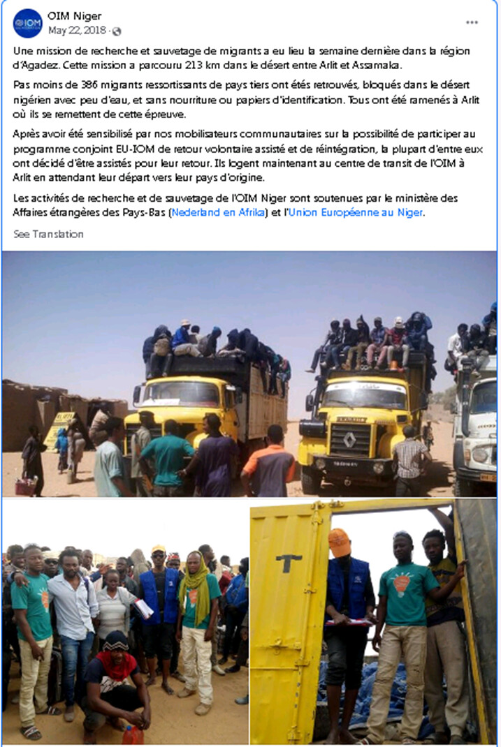 وأوضح فريق التحقيق أن الصورة الأولى تعود إلى مهمة إنقاذ قامت بها المنظمة الدولية للهجرة في النيجر نقلت فيها مهاجرين، وُجدوا في أغاديز في صحراء شمالي النيجر دون طعام وأوراق ثبوتية،إلى مركز عبور المنظمة الدولية للهجرة في مدينة ألريت النيجيرية لتلقي المساعدة، في ماي عام 2018.