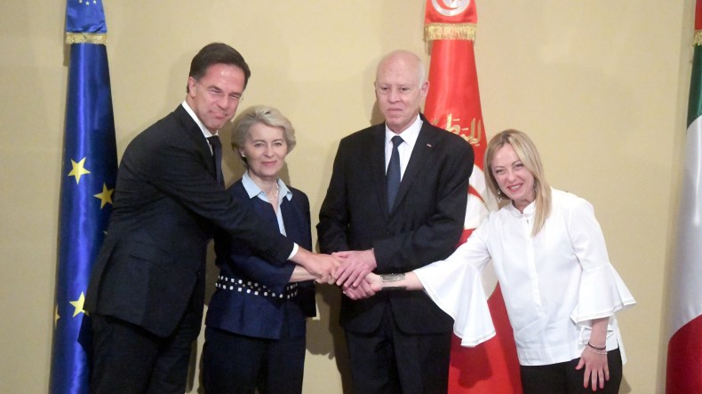حفل التوقيع شهده كل من رئيس الجمهورية التونسية قيس سعيد ورئيسة المفوضية الأوروبية أورسولا فون دير لاين ورئيسة مجلس الوزراء الإيطالية جورجيا ميلوني والوزير الأول الهولندي مارك روته.