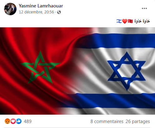 ونشرت ياسمين لمغور، النائبة البرلمانية عن حزب التجمع الوطني للأحرار، الذي يقوده رئيس الحكومة عزيز أخنوش، صورة تجمع العلمين الإسرائيلي والمغربي وكتبت: “خاوة خاوة”.